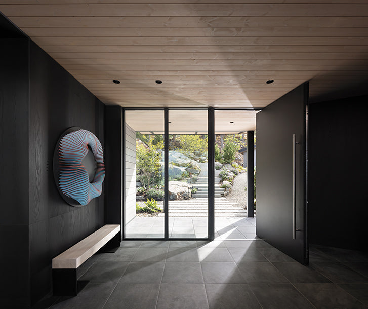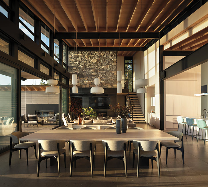 The exposed architecture and rugged outdoor surroundings were a major inspiration for the interior design by Stephanie Brown Inc. which also features softer Scandinavian influences. Light Ash wood and pale blue, green, and grey tones create a soft and calming palette within the space, which is a refreshing spin on west-coast-modern style.